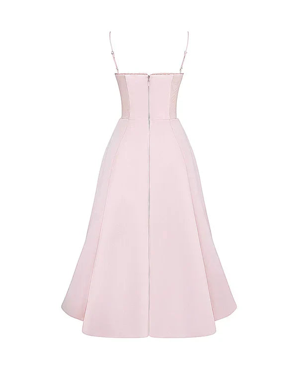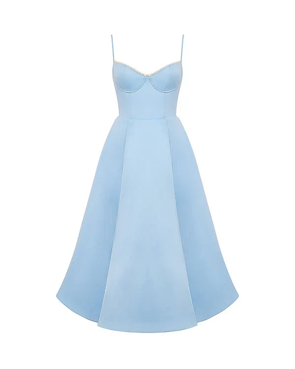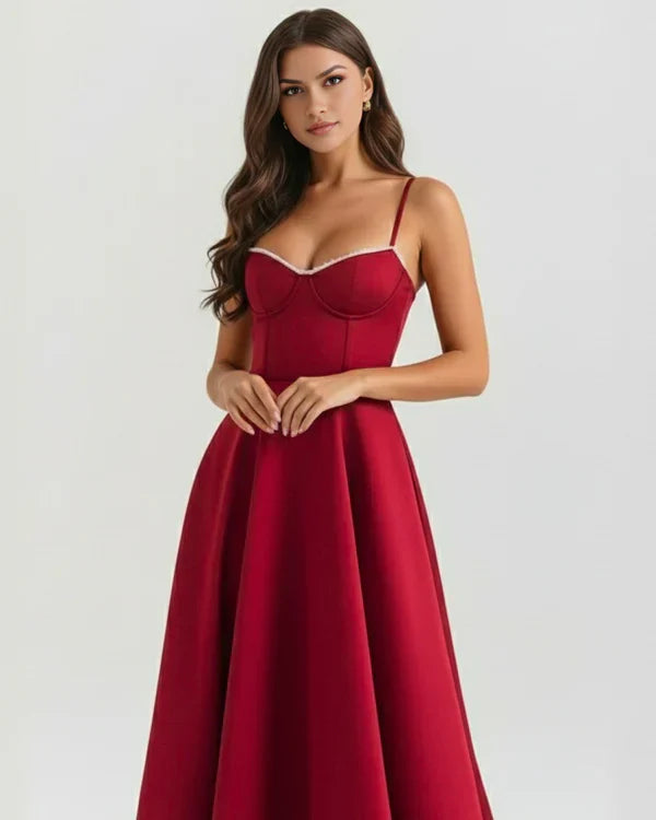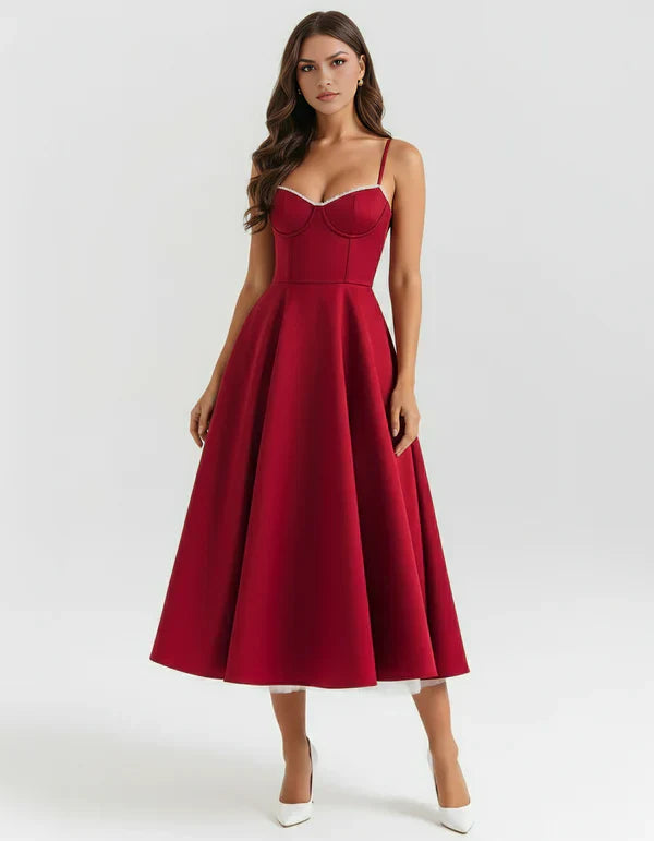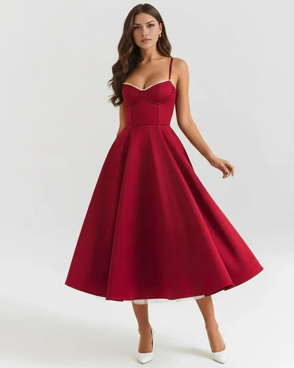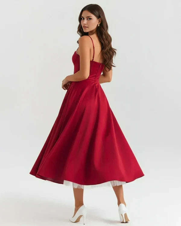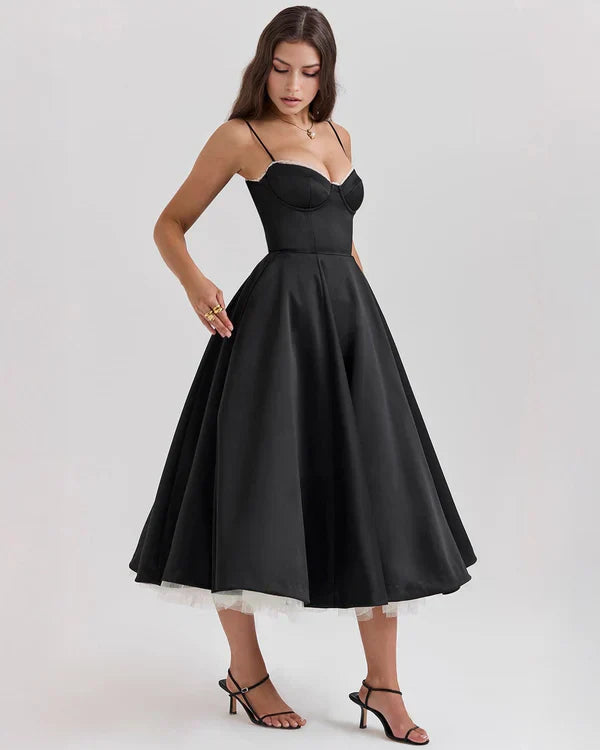 Nuestro vestido midi “Selene” combina elegancia y encanto con su tejido satinado brillante y suave malla elástica. El corpiño con ballenas realza la cintura y el escote corazón con copas aporta soporte y feminidad. Los tirantes ajustables garantizan un ajuste perfecto, mientras que la falda midi con tul añade volumen y un toque de glamour sofisticado.